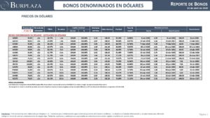 Informe de Bonos del 29.04.2019 VER REPORTE DE BONOS COMPLETO TÍTULOS PÚBLICOS EMITIDOS EN DÓLARES. En el segmento de títulos públicos emitidos en dólares los rendimientos varían entre 10.61% y 20.09%, según sea el vencimiento del instrumento. La duration del bono, entendida como el plazo promedio ponderado de la inversión […]